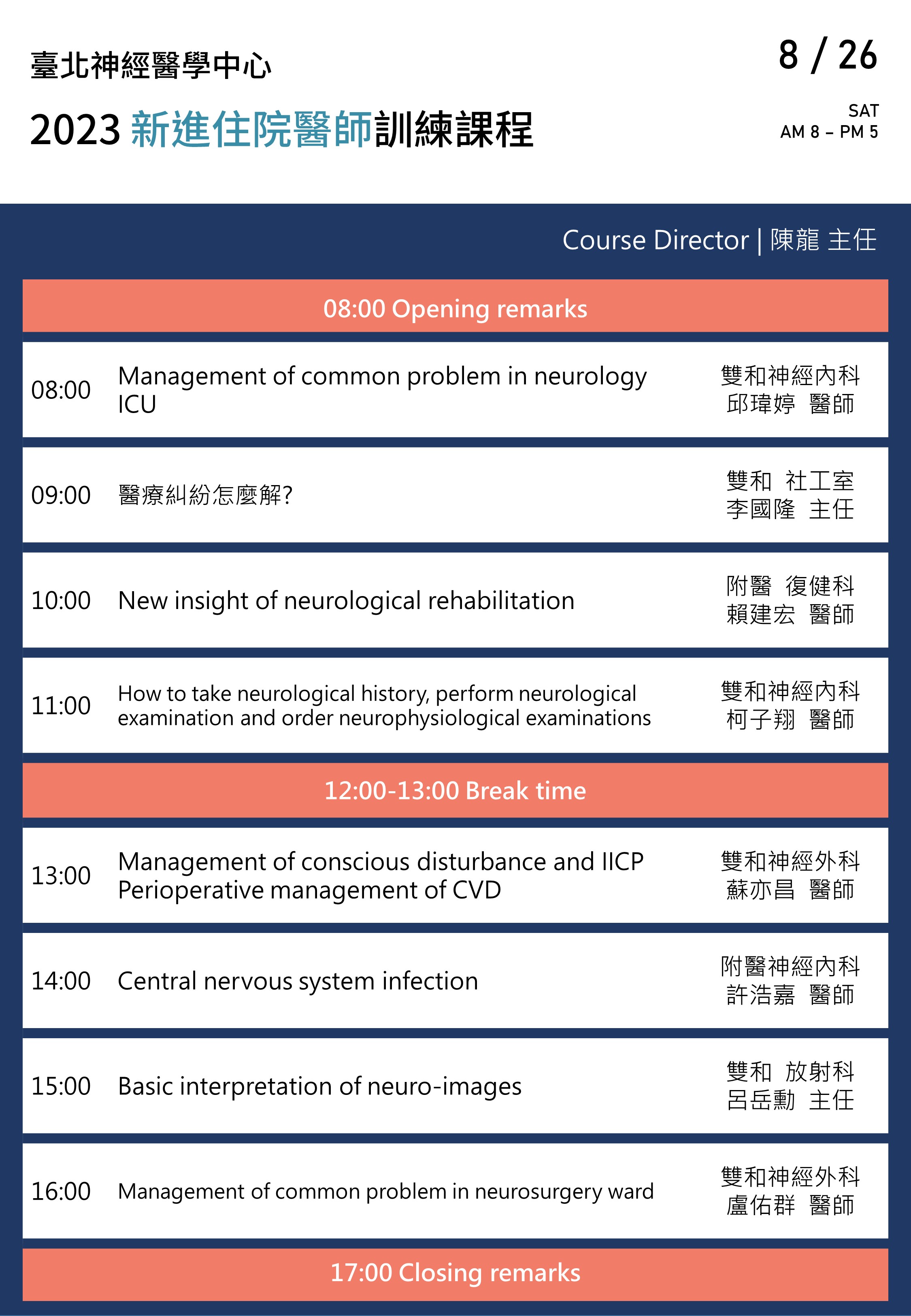 2023 年 8 月 26 日(六)早上 8:00 至下午 5:00 將舉辦臺北神經醫學中心 新進住院醫師訓練課程,歡迎大家透過 Zoom 線上參與!